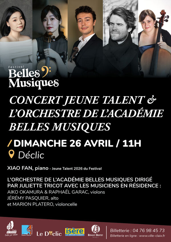 La pianiste Xiao Fan, Jeune Talent 2026 du festival, venue de Chine et actuellement en fin de Licence au CNSMD de Lyon, se produit en soliste en ouverture de ce concert de l’Académie Belles Musiques, dirigé parJuliette Tricot. L’orchestre réunit des élèves, des musiciens amateurs et des professionnels de l’Espace Musical Fernand Veyret de Claix et du Centre d'Éducation Musicale de Seyssins, ainsi que le quatuor à cordes en résidence : Aiko Okamura et Raphaël Garac (violons), Jérémy Pasquier (alto) et Marion Platero (violoncelle).
